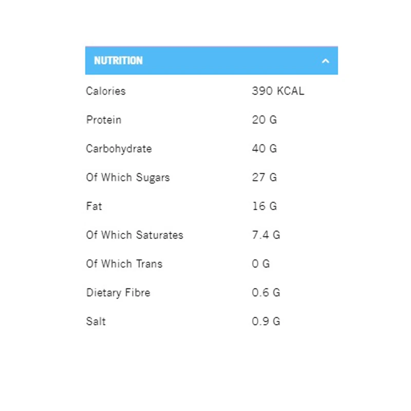 المكونات: خليط البسكويت (سكر، مركز بروتين مصل اللبن (الحليب)، بروتين الحليب، دقيق القمح (دقيق القمح، الكالسيوم، الحديد، النياسين، الثيامين)، الزيوت النباتية (النخيل، بذور اللفت)، نكهة الفانيليا الطبيعية، دبس القصب، مواد رافعة ( E450(i)، E500، E501)، سمن نباتي (زيوت نباتية (النخيل، بذور اللفت)، ملح، مستحلب: أحماض دهنية أحادية وثنائية، نكهة طبيعية، ألوان طبيعية (أناتو، كركمين))، قطع شوكولاتة الحليب مقببة (11 %) (سكر، مسحوق حليب كامل الدسم، زبدة الكاكاو، كتلة الكاكاو، مسحوق مصل اللبن (الحليب)، مستحلب (ليسيثين دوار الشمس)، مستخلص الفانيليا)، سكر، مرطب: جليسرين نباتي، نكهة طبيعية.