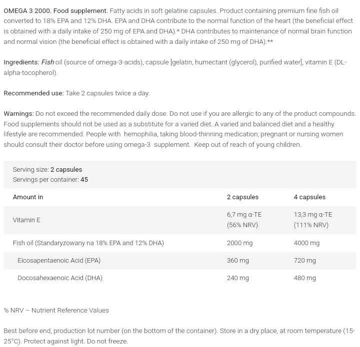 أوميجا 3 2000. مكمل غذائي. الأحماض الدهنية في كبسولات جيلاتينية رخوة. منتج يحتوي على زيت السمك الفاخر المحول إلى 18% EPA و12% DHA. يساهم EPA وDHA في الوظيفة الطبيعية للقلب (يتم الحصول على التأثير المفيد من خلال تناول 250 ملغ من EPA وDHA يوميًا).* يساهم DHA في الحفاظ على وظائف المخ الطبيعية والرؤية الطبيعية (يتم الحصول على التأثير المفيد من خلال المدخول اليومي من 250 ملغ من DHA).**