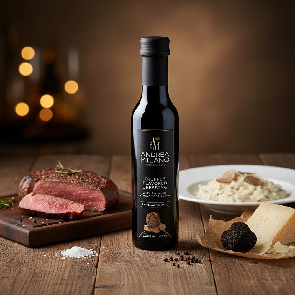 خلّ النبيذ، خلّ بلسميك من Modena بنسبة 20% (خلّ النبيذ، عصير عنب مُركّز، ملوّن: كراميل E150d)، عصير عنب مُركّز، نكهة، مسحوق الكمأة.