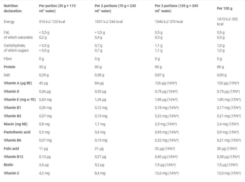 97.5% بروتين مصل اللبن المعزول، نكهات، منظم حموضة - حمض الماليك، مواد مكثفة - زانثان، كربوكسي ميثيل السليلوز؛ محليات - أسيسولفام ك، سكرالوز؛ الفيتامينات (حمض الأسكوربيك - فيتامين ج، أسيتات دل-ألفا-توكوفيريل - فيتامين هـ، نيكوتيناميد - نياسين، بيوتين، أسيتات ريتينيل - فيتامين أ، بانتوثينات الكالسيوم - حمض البانتوثينيك، هيدروكلوريد البيريدوكسين - فيتامين ب6، كوليكالسيفيرول - فيتامين د، حمض بتيرويل مونوجلوتاميك - حمض الفوليك، أحادي نترات الثيامين - فيتامين ب1، ريبوفلافين - فيتامين ب2، سيانوكوبالامين - فيتامين ب12)، الألوان: كارمين (لنكهات الفراولة، الكرز، الفراولة-كيوي، الموز-الكرز)، E 150c (لنكهات التيراميسو، التوفي، الشوكولاتة، القهوة، القهوة المثلجة، البندق، الكابتشينو)، ريبوفلافين، E 133 (لنكهة الفستق).