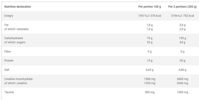 80% مزيج كربوهيدرات (مالتوديكسترين، دكستروز)، 15.5% مزيج بروتين (مركز بروتين مصل اللبن (من الحليب)، كازين ميسيلار (من الحليب)، بروتين البيض فائق الترشيح)، نكهات، مونوهيدرات الكرياتين، توراين، مكثفات - صمغ عربي ، صمغ الزانثان، كربوكسي ميثيل السليلوز الصوديوم؛ منظمات الحموضة - حامض الستريك، سترات الصوديوم؛ التحلية – اسيسولفام ك؛ مستحلب - الليسيثين (من فول الصويا)؛ الألوان: 150 ج.