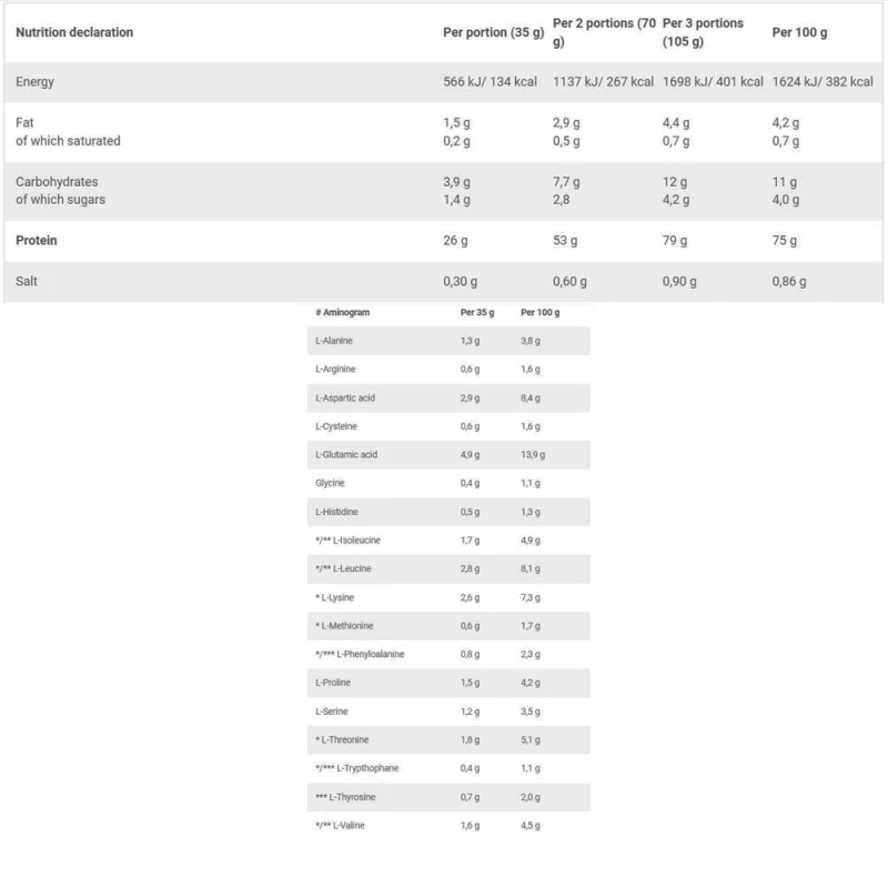 مستحضرات بروتين بنسبة 95% (مركز بروتين مصل اللبن فائق الترشيح WPC (من الحليب)، معزول بروتين مصل اللبن WPI-CFM® (من الحليب))، نكهات، زيت مع أحماض دهنية متوسطة السلسلة (زيت MCT)، فركتوز، منظمات حموضة - حمض الماليك، حمض الستريك، سترات الصوديوم؛ مكثفات - صمغ عربي، صمغ زانثان، كربوكسي ميثيل سليلوز الصوديوم؛ محليات - أسيسولفام K، سكرالوز، سيكلامات (Z)؛ مستحلب - ليسيثين (من فول الصويا)؛ ملح، أصباغ: كاروتينات (أ)، قرمزي (ب)، ريبوفلافين (ج)، E 150c (د)، E 150d (هـ)، E 133 (و)، أزرق براءات الاختراع V (ز)، كارمين نيلي (ح)، كلوروفيل وكلوروفيلين (ط)، كركمين (ي)، أنثوسيانين (ك)، مستخلص الفلفل (ل)، بيتانين (م)، كربون نباتي (ن). قد يحتوي المنتج على الفول السوداني.