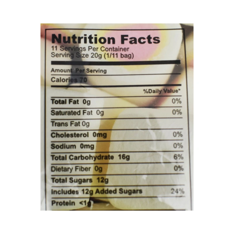 سكر وشراب الذرة وسكر العنب وجيلاتين اللحم البقري (حلال). نشا الذرة ونكهة غذائية ولون غذائي اي ١٢٩ . اي ١١٠ اي ١٣٢ اي ١٣٣ اي ١٠٢