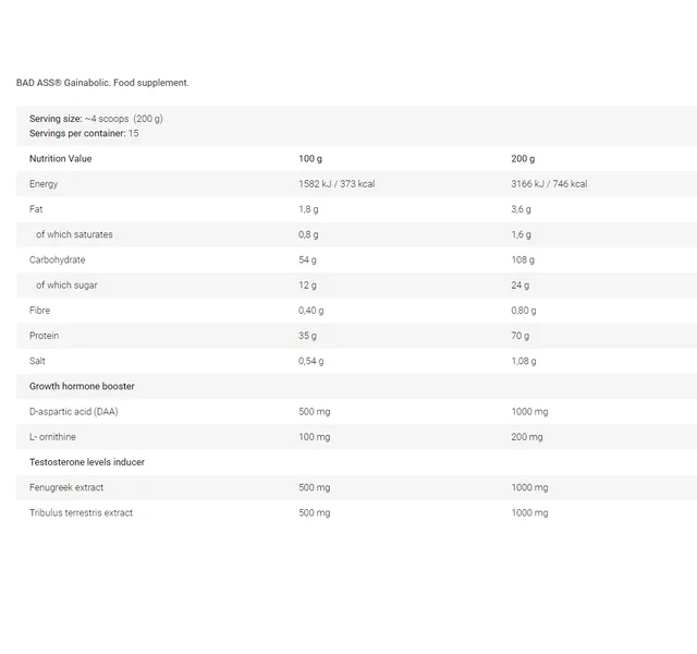 القيمة الغذائية: 56 غرام بروتين، 252 غرام كربوهيدرات، 10.2 غرام بي سي ايه ايه و 5 غرام كرياتين.