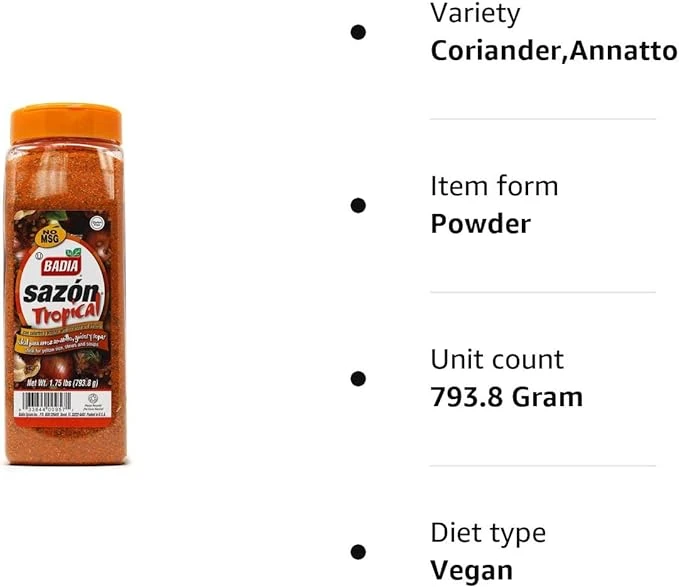 المكونات: ملح، ثوم وبصل مجفف، توابل، أصفر FD&C رقم 5، غوانيلات وأينوزينات ثنائي الصوديوم، كزبرة، أناتو، أحمر FD&C رقم 40، فلفل بابريكا، وثلاثي فوسفات الكالسيوم (كمادة مانعة للتكتل).