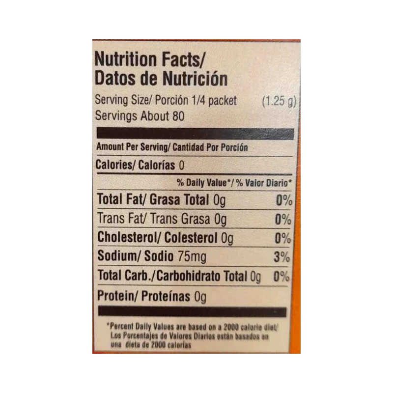 ملح، ثوم وبصل مجفف، توابل، أصفر FD&C رقم 5، غوانيلات وأينوزينات ثنائي الصوديوم، كزبرة، أناتو، أحمر FD&C رقم 40، فلفل بابريكا، وثلاثي فوسفات الكالسيوم (كمادة مانعة للتكتل).