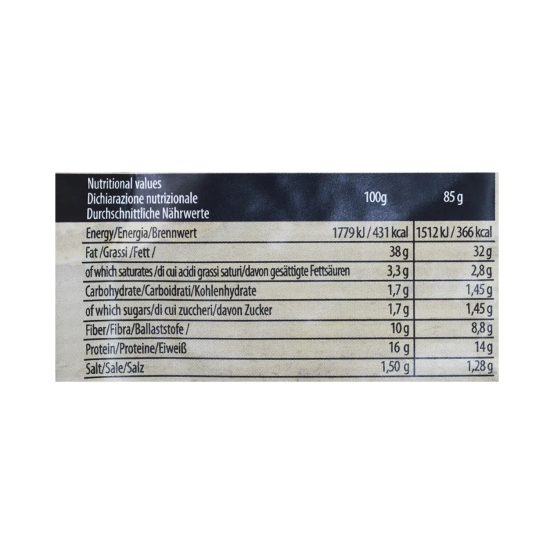 المكونات: ماء، دقيق اللوز، ألياف (من قطونة Psyllium، خيزران، تفاح)، بياض البيض، ملح، عوامل رفع (طرطرات البوتاسيوم، بيكربونات الصوديوم)، سمسم 1%، مادة حافظة: سوربات البوتاسيوم. قد يحتوي على الصويا.