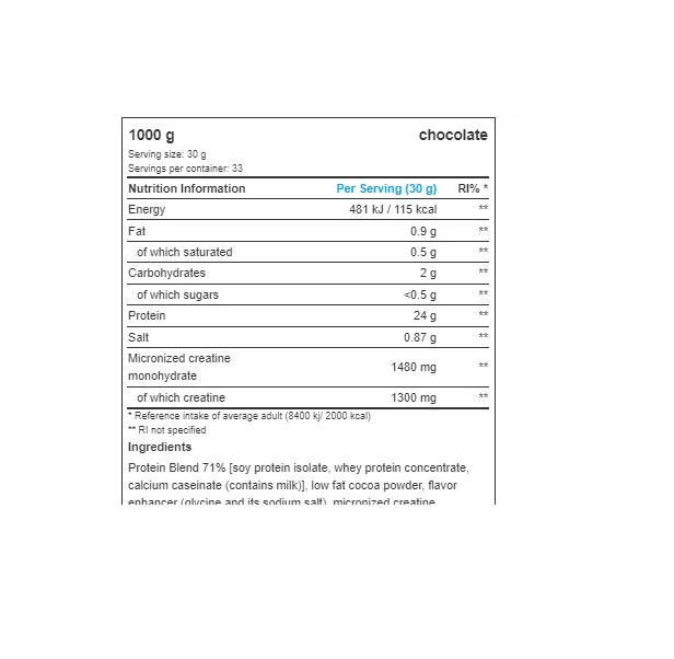 المكونات: مزيج البروتين 71% [بروتين الصويا المعزول، مركز بروتين مصل اللبن (الحليب)، كازينات الكالسيوم (يحتوي على الحليب)]، مسحوق الكاكاو منزوع الدسم، محسن النكهة (جلايسين وملح الصوديوم)، مونوهيدرات الكرياتين المجهري 5%، نكهات، مضاد للأكسدة. عوامل التكتل (أملاح الأحماض الدهنية المغنيسيوم، ثاني أكسيد السيليكون)، الملح، مستحلب: الليسيثين (فول الصويا)، المحليات (سوكرالوز، اسيسولفام K)، مثخن (صمغ السليلوز).