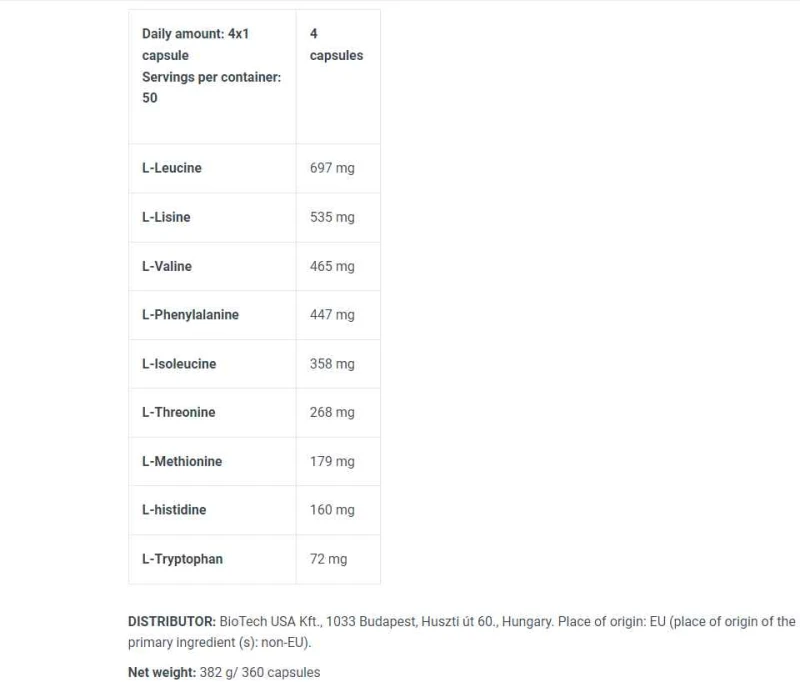 ل- ليوسين (19.4%)، ل-ليسين هيدروكلوريد (18.6%)، غلاف الكبسولة [جيلاتين، عامل تزجيج (شيلاك)، لون (أكاسيد الحديد والهيدروكسيدات)، منظم الحموضة (هيدروكسيد الأمونيوم)، منظم الحموضة (هيدروكسيد البوتاسيوم)]، ل - فالين (13%)، ل-فينيل ألانين (12.5%)، ل-آيزوليوسين (10%)، ل-ثريونين (7.5%)، ل-هيستيدين هيدروكلوريد (6%)، ل-ميثيونين (5%)، عامل ضخم. (جل السليلوز)، إل-تريبتوفان (2%)، عوامل مضادة للتكتل (أملاح المغنيسيوم للأحماض الدهنية، ثاني أكسيد السيليكون). يصنع في مصنع يقوم بتصنيع الحليب والبيض والغلوتين وفول الصويا والقشريات وثاني أكسيد الكبريت والمكسرات التي تحتوي على الأطعمة.