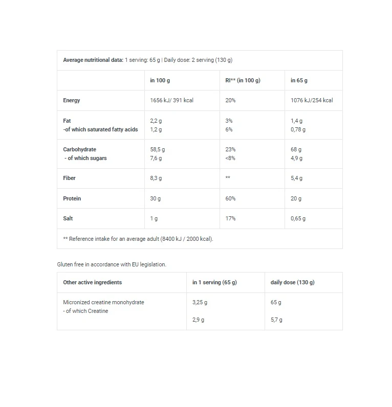 مسحوق]، ببتيد الجلوتامين (يحتوي على القمح)، مثخن (صمغ السليلوز)، مستحلب: ليسيثين (فول الصويا)، كرياتين مونوهيدرات ميكروني 3٪، منكهات، ملح.