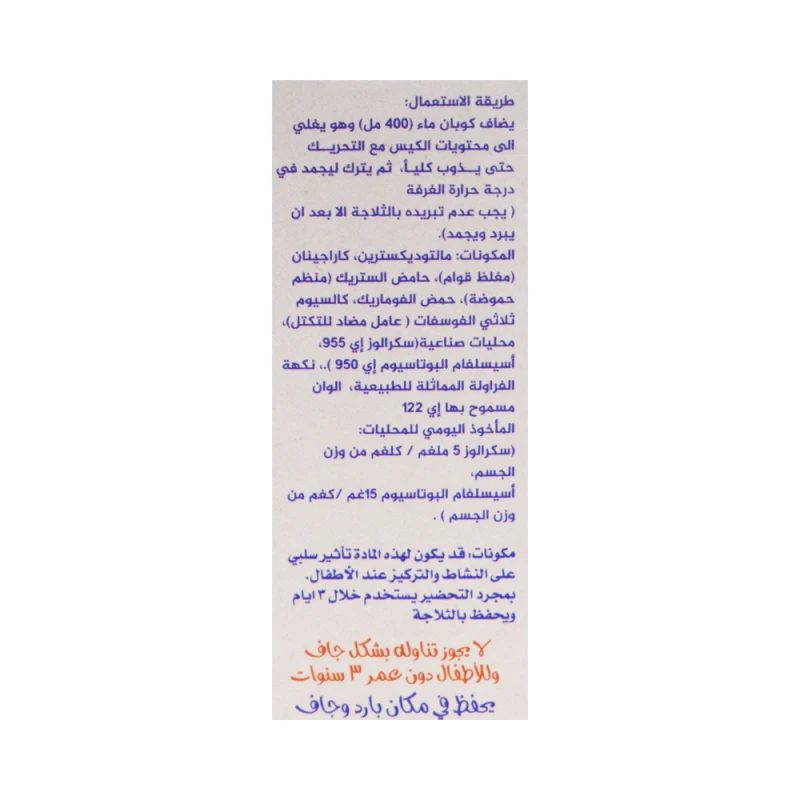 مالتوديكسترين، كاراجينان (مغلظ قوام)، حامض الستريك (منظم حموضة)، حمض الفوماريك، كالسيوم ثلاثي الفوسفات (عامل مضاد للتكتل)، محليات صناعية (سكرالوز إي 955، أسيسلفام البوتاسيوم إي 950)، نكهة الفراولة المماثلة للطبيعية، ألوان مسموح بها إي 122