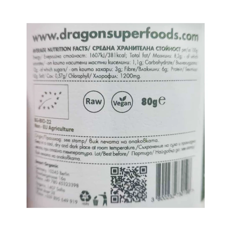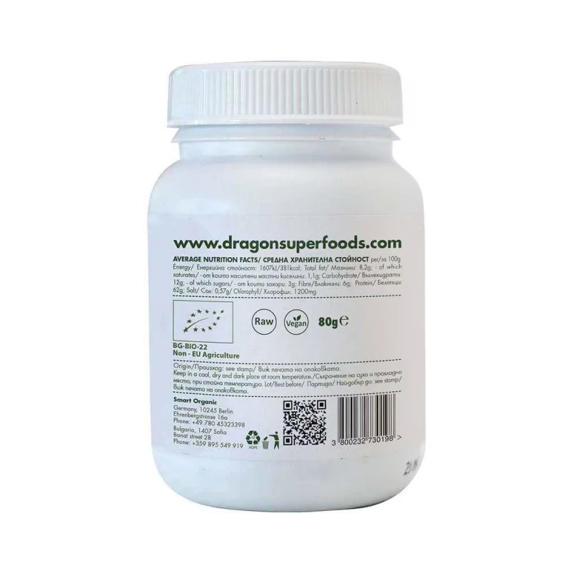 سبيرولينا (أرثروسبيرا بلاتنسيس) هي طحالب خضراء زرقاء أحادية الخلية ذات بنية حلزونية للخلية. اللون النموذجي للسبيرولينا يرجع إلى محتواه الكبير من الكلوروفيل. تمتلك هذه الطحالب أيضًا رائحة وطعمًا مميزًا. يمكن مضغ أو ابتلاع أقراص Dragon Superfoods Spirulina، مما يجعلها مثالية لتناولها يوميًا.