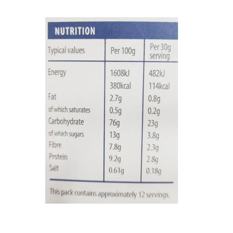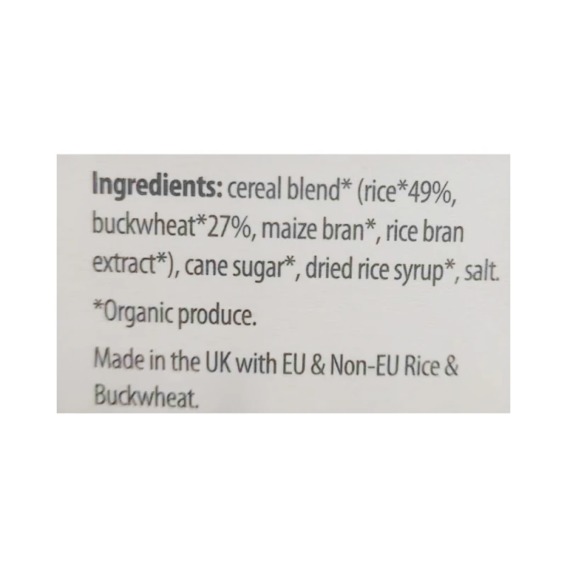 رقائق حبوب مقرمشة وعضوية ، غنية بالألياف وقليلة الدهون. مصنوع من مزيج خالٍ من الغلوتين بشكل طبيعي من الأرز والحنطة السوداء ، بدون قمح أو مكسرات أو صويا أو حليب أو بيض أو دهون مهدرجة.