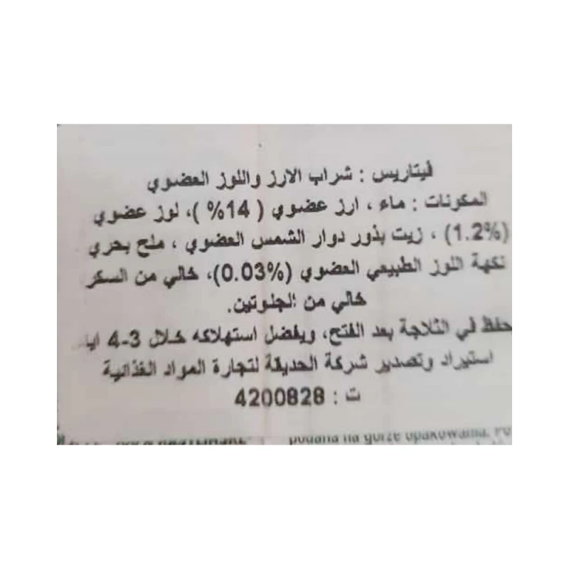 ماء , ارز عضوي (14%) لوز عضوي (1.2%) زيت بذور دوار الشمس العضوي , ملح بحري , نكهة اللوز الطبيعي ( 0.03%) خالي من السكر , خالي من الجلوتين .
