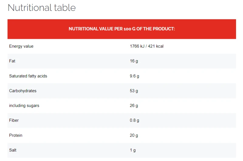المكونات: كوكيز 21% (دقيق القمح، سكر، زبدة مصفاة (سمن) (حليب)، مسحوق الخروب، ملح بحري، عامل رافعة: كربونات الصوديوم)، شراب الجلوكوز، مركز بروتين مصل اللبن (حليب)، معزول الصويا، دهون نباتية (غير مقساة). النخيل، الشيا) بنسب متفاوتة، المحليات: المالتيتول؛ السكر، مرطب: الجلسرين. زيت دوار الشمس، مالتوديكسترين، مسحوق حليب منزوع الدسم، 2.3% كراميل (سكر مكرمل)، سكر القصب، نشا التابيوكا، ملح البحر، ملح، نكهات، مستحلب: ليسيثين الصويا.
