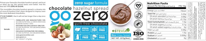 (مستخلص نبات ستيفيا)، بودرة الكاكاو منزوعة الدسم 6%، معجون البندق 6%، رقائق الأرز 5%، نشا الذرة، زبدة الكاكاو، زيت بذرة القطن، مستحلب: ليسيثين الصويا، نكهة.