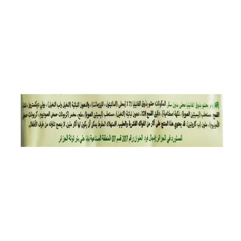 كريم بنكهة الفانيليا (محليات (مالتيتول وإيزومالت)، دهن نباتي (النخيل ونواة النخيل)، بولي دكستروز، نشاء القمح، مستحلب (ليسيثين الصويا)، رائحة)، دقيق القمح، دهن نباتي (النخيل)، مستحلب (ليسيثين الصويا)، ملح ، عوامل رافعة (كربونات هيدروجين الصوديوم وكربونات هيدروجين الأمونيوم)، تلوين (بيتا كاروتين). قد يحتوي على آثار من المكسرات والحليب.