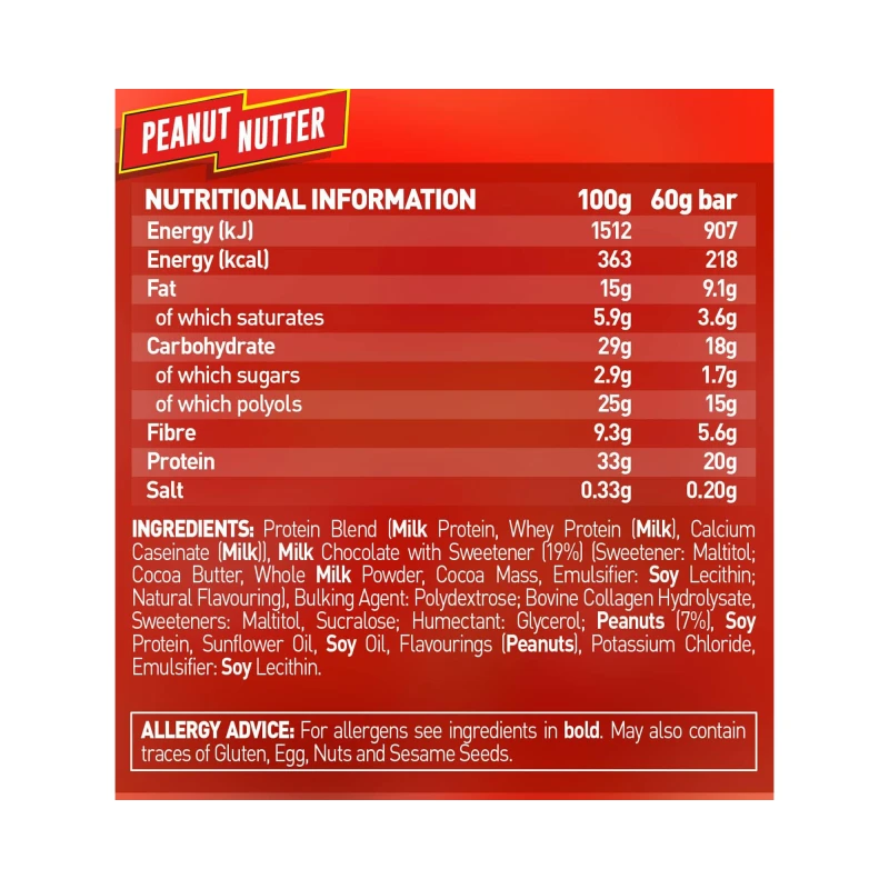 المكونات: مزيج البروتين (بروتين الحليب، بروتين مصل اللبن (الحليب)، كازينات الكالسيوم (الحليب))، شوكولاتة الحليب مع المُحلي (19٪) (المحلي: مالتيتول، زبدة الكاكاو، مسحوق الحليب كامل الدسم، كتلة الكاكاو، مستحلب: ليسيثين الصويا، طبيعي النكهة)، عامل يستكثر: بوليدكستروز؛ هيدروليسات الكولاجين البقري، المحليات: مالتيتول، سوكرالوز؛ مرطب: الجلسرين. الفول السوداني (7%)، بروتين الصويا، زيت دوار الشمس، زيت الصويا، المنكهات (الفول السوداني)، كلوريد البوتاسيوم، مستحلب: ليسيثين الصويا.