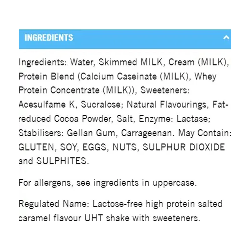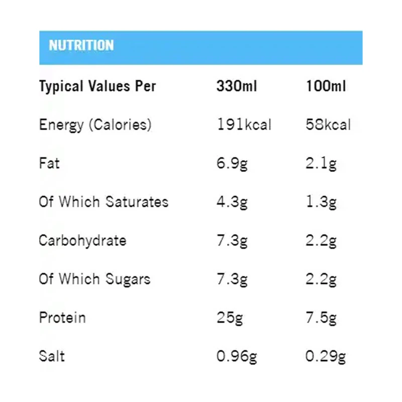ماء، حليب منزوع الدسم، كريمة (حليب)، مزيج البروتين (كازينات الكالسيوم (حليب)، مركز بروتين مصل اللبن (حليب))، المحليات: أسيسولفام ك، سكرالوز؛ نكهات طبيعية، مسحوق كاكاو قليل الدسم، ملح، إنزيم: لاكتاز؛ المثبتات: صمغ جيلان، الكاراجينان. قد تحتوي على: الغلوتين، الصويا، البيض، المكسرات، ثاني أكسيد الكبريت والكبريتات.