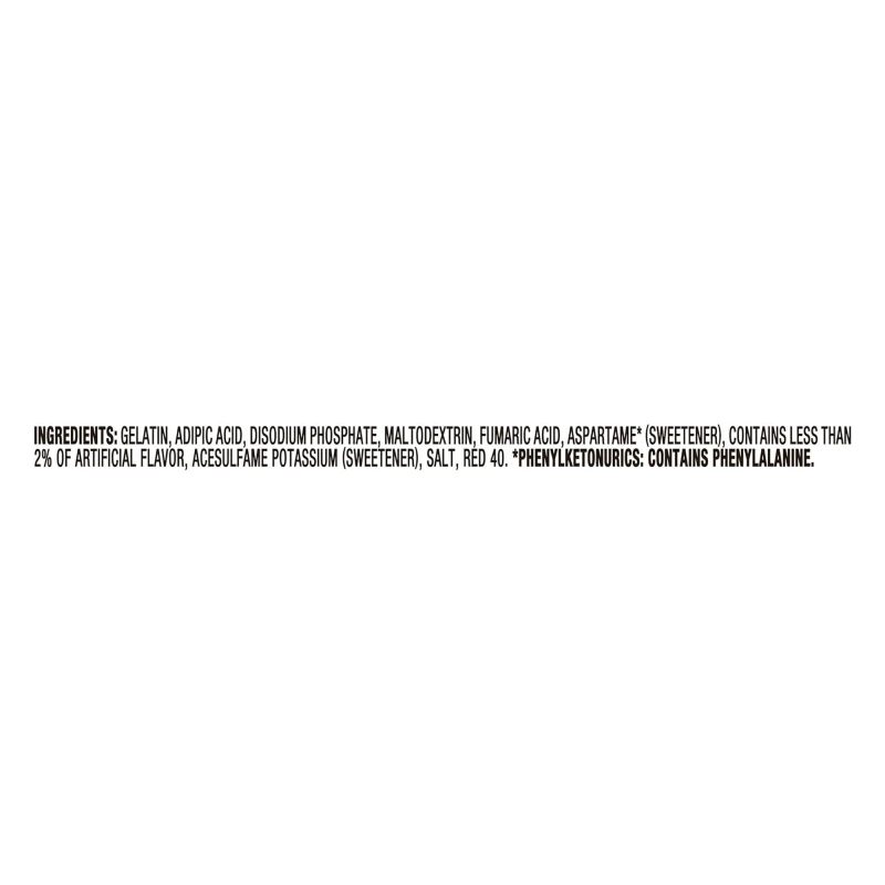 جيلاتين، حمض الأديبيك، فوسفات ثنائي الصوديوم، مالتوديكسترين، حمض الفوماريك، أسبارتام (محلي)، يحتوي على أقل من 2% من نكهة طبيعية واصطناعية، أسيسلفام البوتاسيوم (محلي)، ملح، لون أصفر 6، لون أحمر 40، BHA (مادة حافظة).