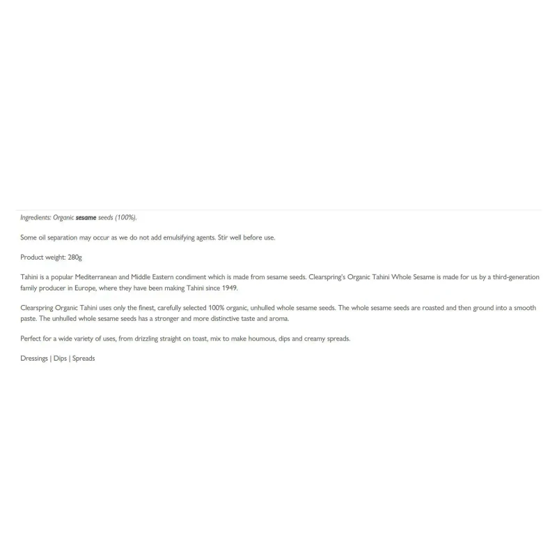 الطحينة هي بهار متوسطي وشرق أوسطي شهير مصنوع من بذور السمسم. طحينة السمسم الكامل العضوي من Clearspring مصنوع من قبل منتج عائلي من الجيل الثالث في أوروبا ، حيث كانوا يصنعون الطحينة منذ عام 1949.