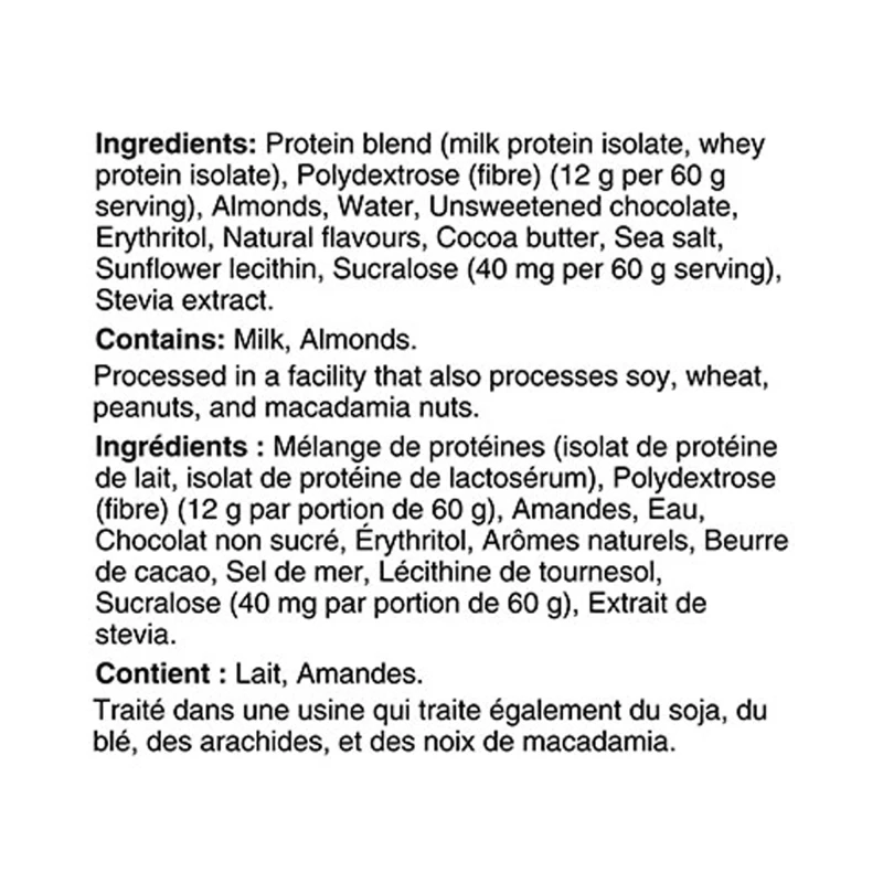 مزيج البروتين (بروتين الحليب المعزول، بروتين مصل اللبن المعزول)، ألياف الذرة القابلة للذوبان، اللوز، الماء، الشوكولاتة غير المحلاة، إريثريتول، النكهات الطبيعية، زبدة الكاكاو. يحتوي على أقل من 2% مما يلي: ملح البحر، ليسيثين عباد الشمس، محلي ستيفيا، سكرالوز.