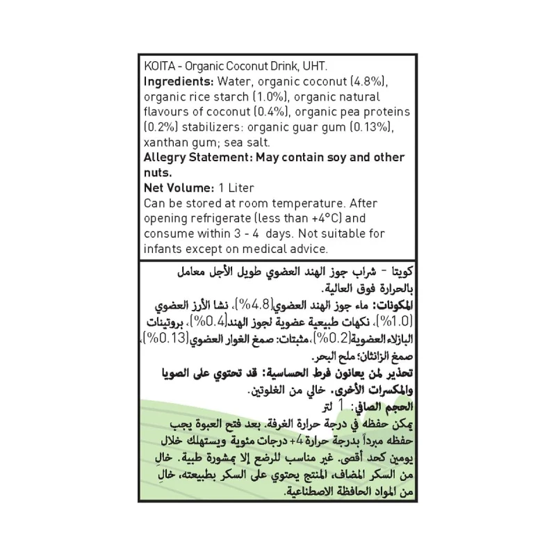 ماء ، جوز الهند العضوي 4.8٪ ، ملح البحر ، نشاء الأرز العضوي ، المثبت: صمغ جيلان ، صمغ الغوار العضوي ؛ نكهة جوز الهند الطبيعية العضوية.