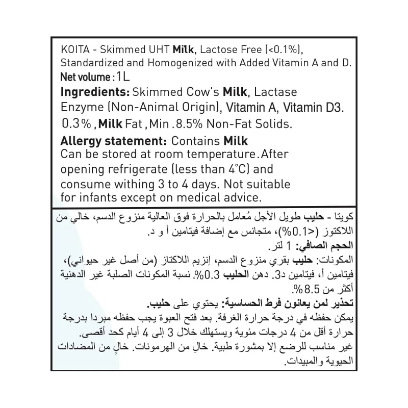 كويتا حليب خالي لاكتوز منزوع الدسم 1 لتر