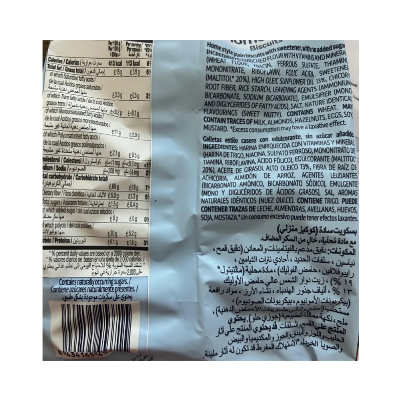المكونات (Ingredients): دقيق مدعم بالفيتامينات والمعادن (دقيق قمح، نياسين، سلفات الحديد، أحادي نترات الثيامين، رايبوفلافين، حامض الفوليك)، مادة محلية (مالتيتول 19% - 20%)، زيت دوار الشمس عالي حمض الأوليك 13%، ألياف جذور الهندباء، نشاء الأرز، مواد رافعة (بيكربونات الأمونيوم، بيكربونات الصوديوم)، ملح، مستحلب (أحادي وثنائي جليسريدات الأحماض الدهنية)، نكهة مماثلة للطبيعية (جوزي حلو)