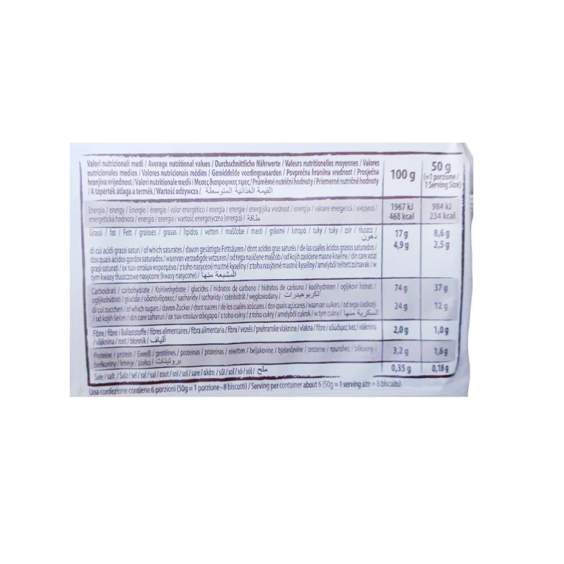 نشا البطاطس ، دقيق الذرة ، نشا ، سكر ، رقائق الشوكولاتة الداكنة 10.3٪ (كاكاو 46٪ كحد أدنى سكر ، معجون كاكاو ، زبدة كاكاو ، مستحلب: ليسيثين الصويا ، رائحة) ، زيت دوار الشمس 10٪ ، زبدة ، مسحوق كاكاو 3.8٪ ، أرز الدقيق والعسل والبيض ومسحوق الحليب منزوع الدسم والروائح وعوامل التخمر: كربونات حمض الأمونيوم وكربونات حمض الصوديوم ؛ الملح ومضادات الأكسدة: مستخلص إكليل الجبل