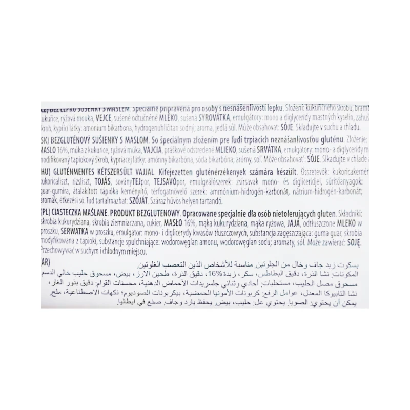 نشا الذرة ، نشا البطاطس ، السكر ، الزبدة 15.9٪ ، دقيق الذرة ، دقيق الأرز ، البيض ، مسحوق الحليب منزوع الدسم ، مسحوق مصل اللبن ، المستحلبات: الأحماض الدهنية الأحادية والثنائية. عوامل التخمر: كربونات حمض الأمونيوم ، كربونات حمض الصوديوم ؛ سماكة: دقيق بذور الغوار ، نشا التابيوكا المعدل ، الروائح ، الملح. قد تحتوي على آثار من: فول الصويا.