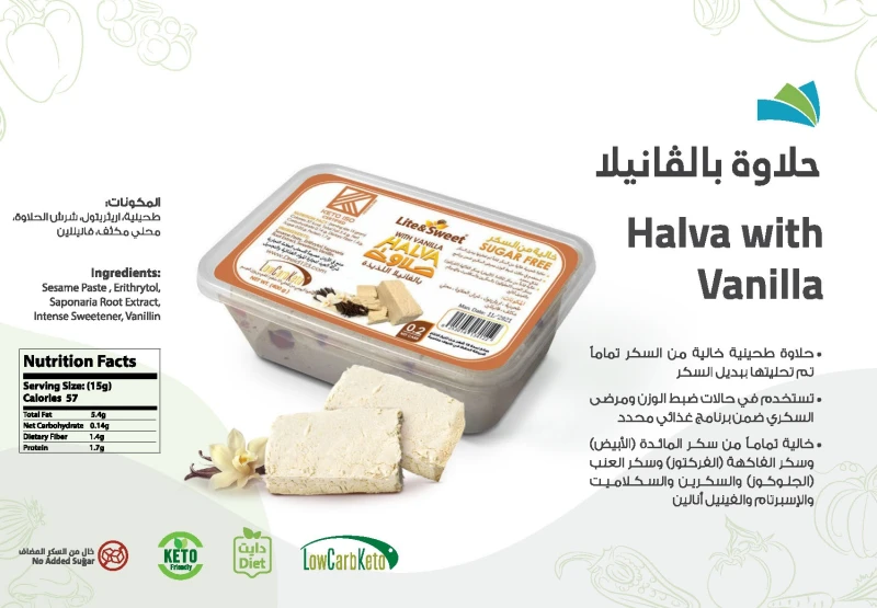 المكونات: طحينية، محلي لايت آند سويت (إريثريتول ، سكرلوز) ، إنولين، شرش الحلاوة، مثبت، نكهة فانيلا.