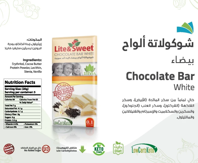 المكونات: زبدة الكاكاو ، ماس الكاكاو الطبيعي ، زبدة جوز الهند ، ليسيثين الصويا ، محلي بديل السكر (إريثريتول ، سكرلوز)، حليب كامل الدسم ، بروتين الحليب ، شوكولاتة البيضاء ، فانيلا.
