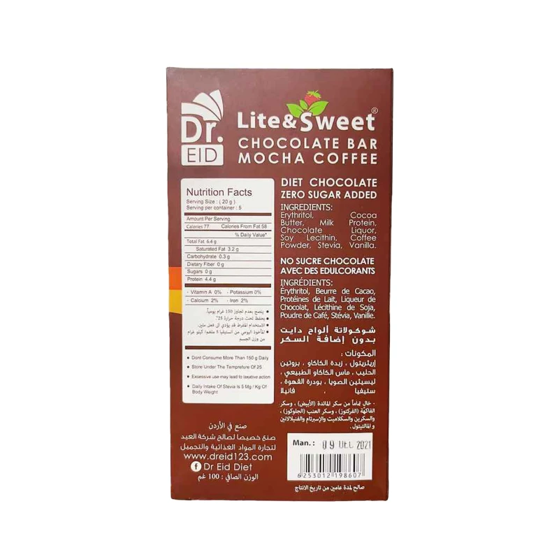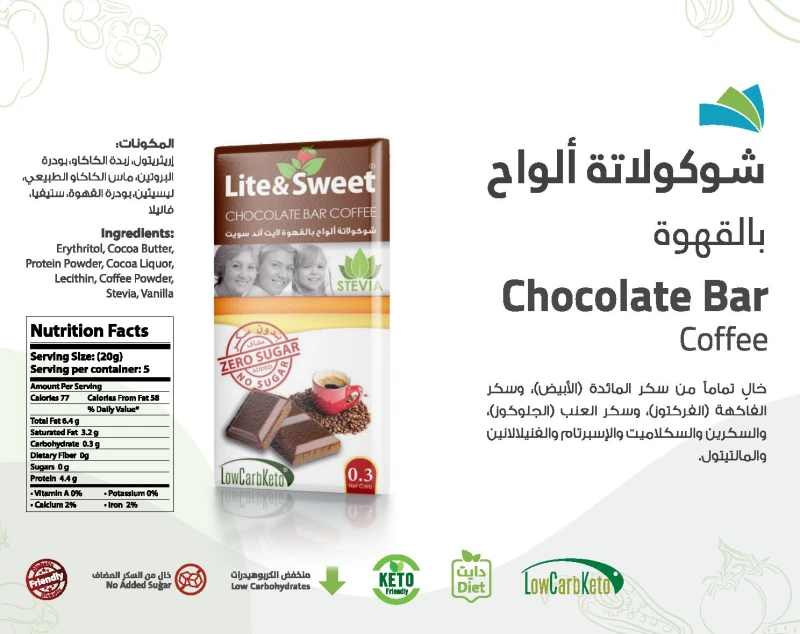 المكونات: زبدة الكاكاو ، ماس الكاكاو الطبيعي ، زبدة جوز الهند ، ليسيثين الصويا ، محلي بديل السكر (إريثريتول ، سكرلوز)، حليب كامل الدسم ، بروتين الحليب ، حبيبات قهوة ، فانيلا.