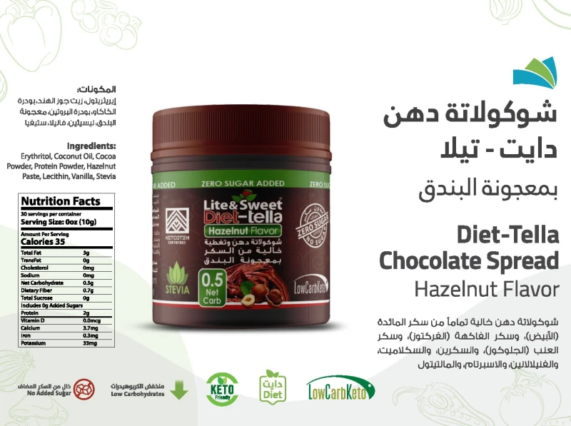 المكونات: محلي لايت آند سويت ( إريثريتول ، سكرلوز ) إنولين ، زيت نباتي ، بودرة الحليب ، بروتين الحليب، بودرة الكاكاو ، نكهة البندق ، ليسيثين الصويا ،، فانيلا .