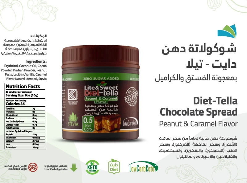 المكونات: محلي لايت آند سويت ( إريثريتول ، سكرلوز ) إنولين ، زيت نباتي ، بودرة الحليب ، بروتين الحليب، بودرة الكاكاو ، معجونة الفول السوداني، ليسيثين الصويا ، نكهة الكرميل ، فانيلا .