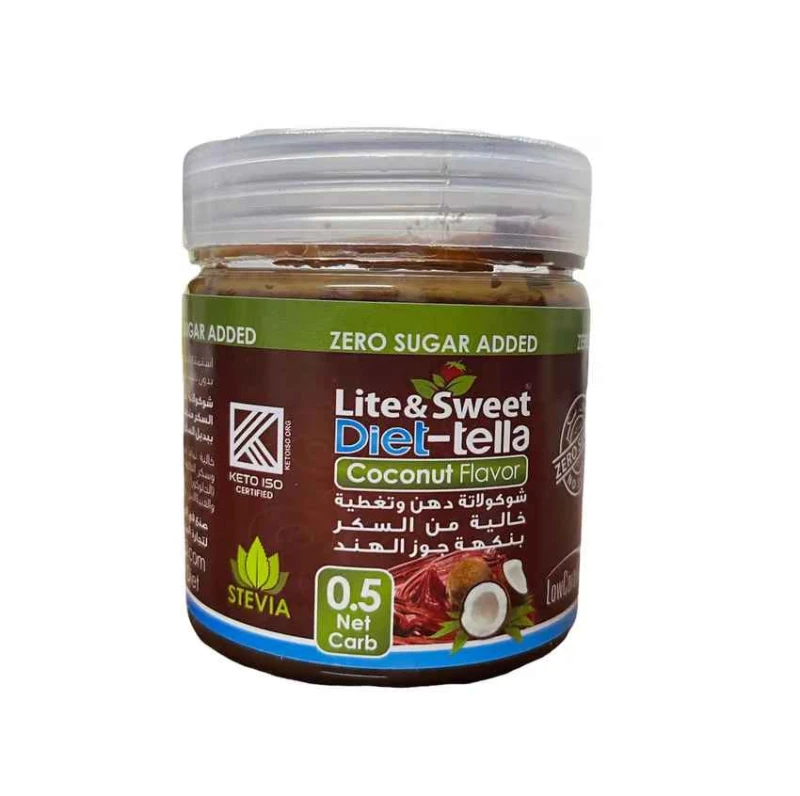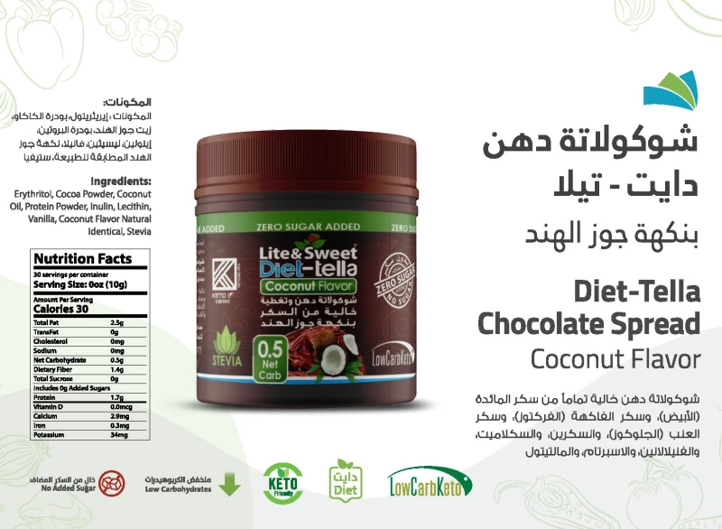 المكونات: محلي لايت آند سويت ( إريثريتول ، سكرلوز ) إنولين ، زيت نباتي ، بودرة الحليب ، بروتين الحليب، بودرة الكاكاو ، نكهة جوز الهند ، ليسيثين الصويا ، زيت جوز الهند ، فانيلا .