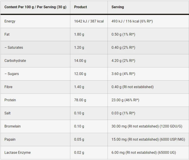 يحتوي مسحوقنا على 75% من البروتين لكل وجبة، ويوفر اللبنات الأساسية اللازمة لمساعدتك على تحقيق أهداف بناء العضلات. تشتمل تركيبتنا على إنزيمات هضمية مثل البروميلين والبابين واللاكتاز لدعم الهضم الأمثل وامتصاص العناصر الغذائية.