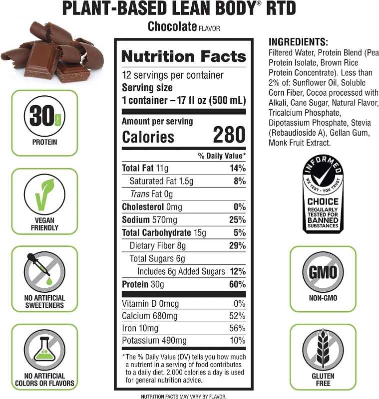 ماء مفلتر ، مزيج البروتين (معزول بروتين البازلاء ، مركز بروتين الأرز البني) ، أقل من 2٪ من: زيت عباد الشمس ، ألياف ذرة قابلة للذوبان ، كاكاو معالج بالقلويات ، قصب السكر ، نكهة طبيعية ، فوسفات ثلاثي الكالسيوم ، فوسفات ثنائي البوتاسيوم ، صمغ جيلان ، ستيفيا (Rebaudioside A) ، مستخلص فاكهة الراهب.