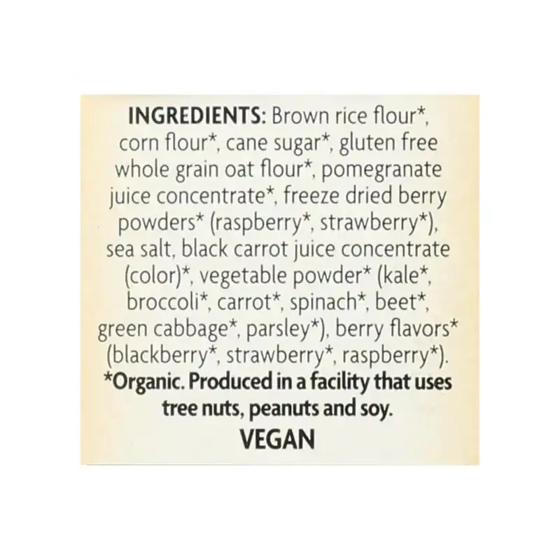 دقيق الأرز البني ؛ دقيق الذرة ؛ سكر القصب ؛ دقيق الشوفان الكامل الخالي من الغلوتين ؛ عصير الرمان المركز ؛ مسحوق التوت المجفف بالتجميد * (توت العليق * ، الفراولة *) ؛ ملح البحر ؛ عصير الجزر الأسود المركز