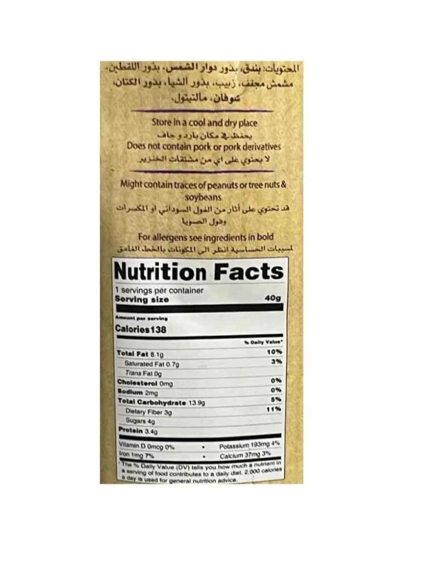 بندق، بذور دوار الشمس، بذور اللقطين، مشمش مجفف، زبيب، بذور الشيا، بذور الكتان، شوفان، مالتيتول.