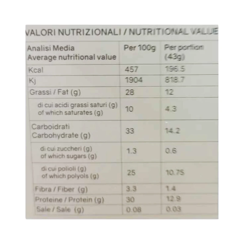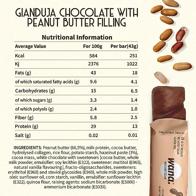 زبدة الفول السوداني (66.5٪) ، بروتين الحليب ، زبدة الكاكاو ، معجون (3٪) ، كتلة الكاكاو ، شوكولاتة بيضاء مع المحليات [زبدة الكاكاو ، مسحوق الحليب كامل الدسم ، مستحلب: ليسيثين الصويا (E322) ، محلي: مالتيتول (E965) ، طبيعي نكهة الفانيليا] ، فركتو قليل السكاريد ، المحليات: إريثريتول (E968) وستفيول جليكوسيدات (E960) ، مسحوق حليب كامل الدسم ، زيت عباد الشمس عالي الأوليك ، نشا الذرة ، فانيلين ، مستحلب: ليسيثين دوار الشمس (E322) ، دقيق الكينو ، عوامل رفع: الصوديوم بيكربونات (E500ii) - بيكربونات الأمونيوم (E503ii)