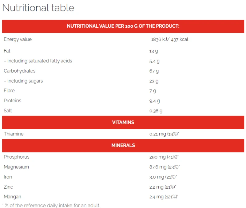 منتج مشتق من الحبوب (رقائق الشوفان الكاملة 55,6%، الدقيق 11%: الشعير، الذرة، جريش الذرة 1,8%)، سكر القصب غير المكرر، دهن النخيل غير المهدرج، شراب الجلوكوز، دبس القصب، رقائق جوز الهند، البحر. ملح، منكهات، مستحلب: الليسيثين (فول الصويا)؛ القرفة، مستخلص الشعير.