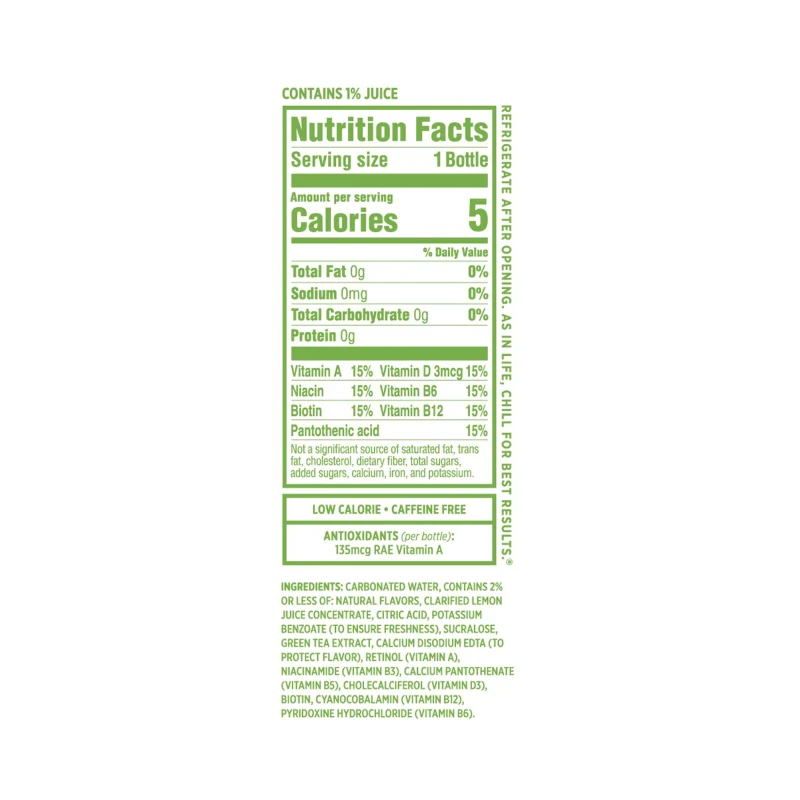 ماء مكربن ، حمض الستريك ، نكهات طبيعية ، مركز عصير ليمون واضح ، بنزوات البوتاسيوم (لضمان نضارة) ، سكرالوز ، مستخلص الشاي الأخضر ، قرص الكالسيوم ، إدتا (لحماية نكهة النيتروجين) كيوم بانتوثينات (فيتامين ب 5) ، كوليكالسيفيرول (فيتامين د 3) ، بيوتين ، سيانوكوبالامين (فيتامين ب 12) ، بيريدوكسين هيدروكلوريد (فيتامين ب 6)
