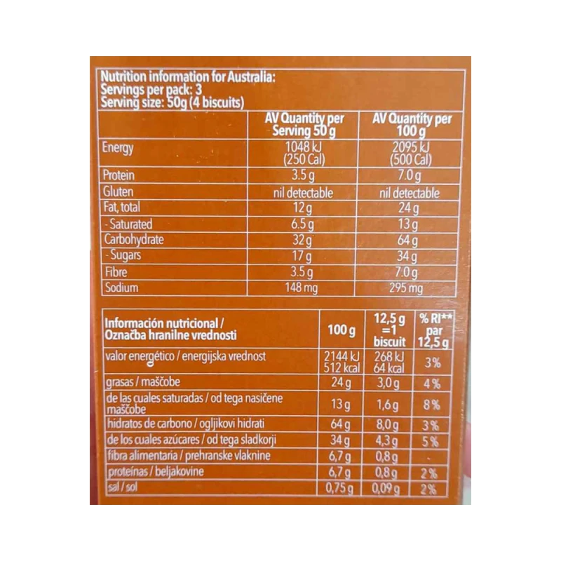 شوكولاتة بالحليب 29٪ (محتوى الكاكاو 35٪ – سكر، زبدة الكاكاو، حليب كامل بودرة 17٪، كتلة الكاكاو 10٪، حليب منزوع الدسم بودرة 3.8٪، مستحلب: ليسيثين الصويا، نكهة طبيعية)، نشا الذرة، زبدة النخيل، سكر القصب، دقيق الذرة، دقيق الصويا، نخالة الصويا، دقيق الحنطة السوداء، شراب السكر، نشا التابيوكا المعدل، ملح، عوامل رفع: كربونات الهيدروجين الأموني، بيكربونات الصوديوم.