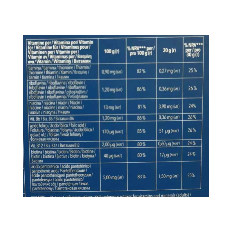 ذرة، سكر، ملح، مستحلب: ليسيثين دوار الشمس؛ فيتامينات (نياسين، حمض البانتوثينيك، فيتامين B6، ريبوفلافين، ثيامين، حمض الفوليك، بيوتين، فيتامين B12). خالٍ من اللاكتوز