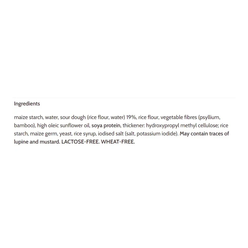 نشا الذرة ، ماء ، عجين مخمر (دقيق أرز ، ماء) 19٪ ، دقيق أرز ، ألياف نباتية (سيلليوم ، خيزران) ، زيت عباد الشمس عالي الأوليك ، بروتين الصويا ، مثخن: هيدروكسي بروبيل ميثيل سلولوز ؛ نشا الأرز ، جرثومة الذرة ، الخميرة ، شراب الأرز ، الملح المعالج باليود (الملح ، يوديد البوتاسيوم) هيدروكسي بروبيل ميثيل سلولوز. قد يحتوي على آثار الترمس والخردل. بدون اللاكتوز. لا قمح.