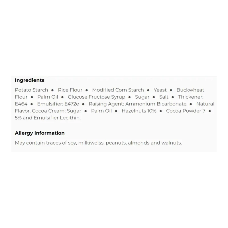 نشا البطاطس، دقيق الأرز، نشا الذرة المعدل، دقيق الحنطة السوداء، مارغرين نباتي [زيت ودهون نباتية بنسب مختلفة (زيت دوار الشمس عالي الأوليك، زبدة الشيا، زيت الصويا، زيت اللفت)، ماء، ملح، عصير ليمون، مستحلب: E-471]، خميرة، شراب الجلوكوز-فركتوز، سكر، ملح، مثخن: E-464؛ مستحلب: E-472e؛ مادة رافعة: E-503؛ نكهة طبيعية.