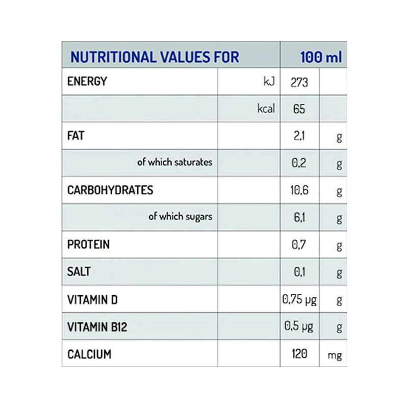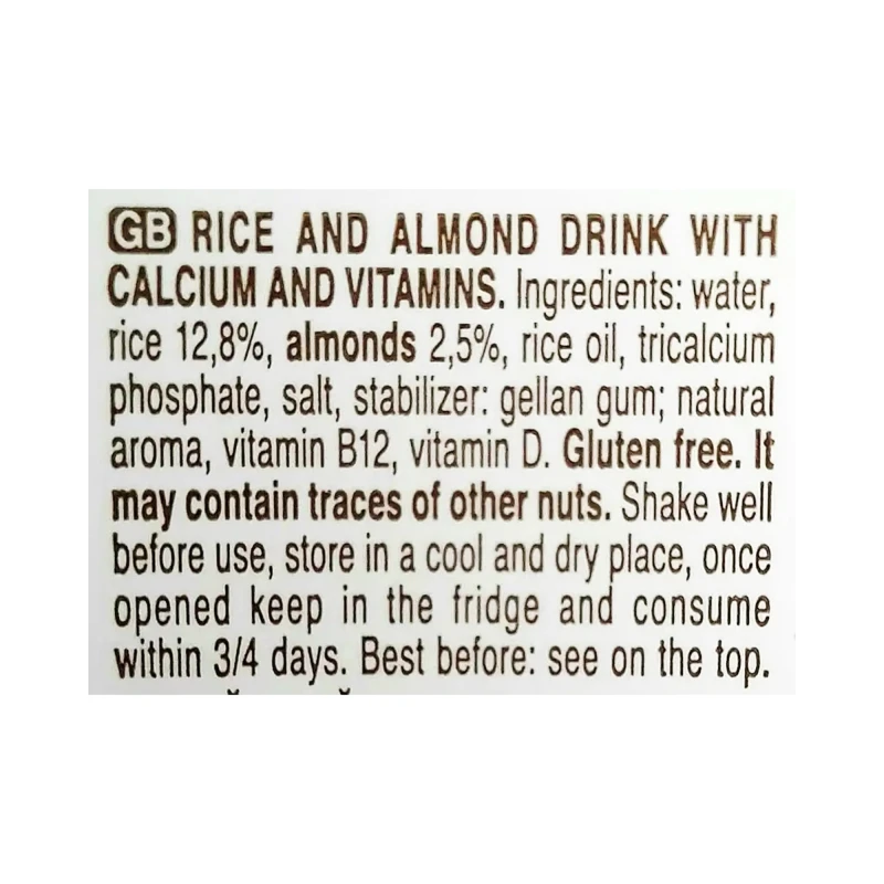 ماء، أرز (12,8%)، لوز (2,5%)، زيت الأرز، فوسفات ثلاثي الكالسيوم، ملح، مثبت: صمغ الجيلان؛ نكهة طبيعية، فيتامين ب12، فيتامين د.