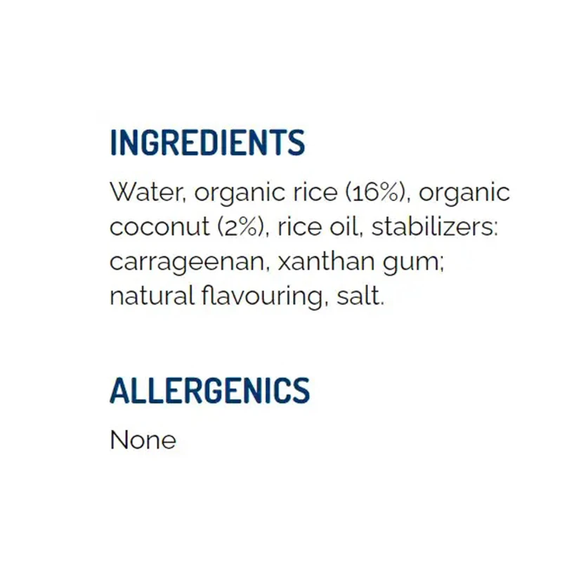 ماء، أرز عضوي (16%)، جوز هند عضوي (2%)، زيت الأرز، مثبتات: الكاراجينان، صمغ الزانثان؛ النكهة الطبيعية والملح.